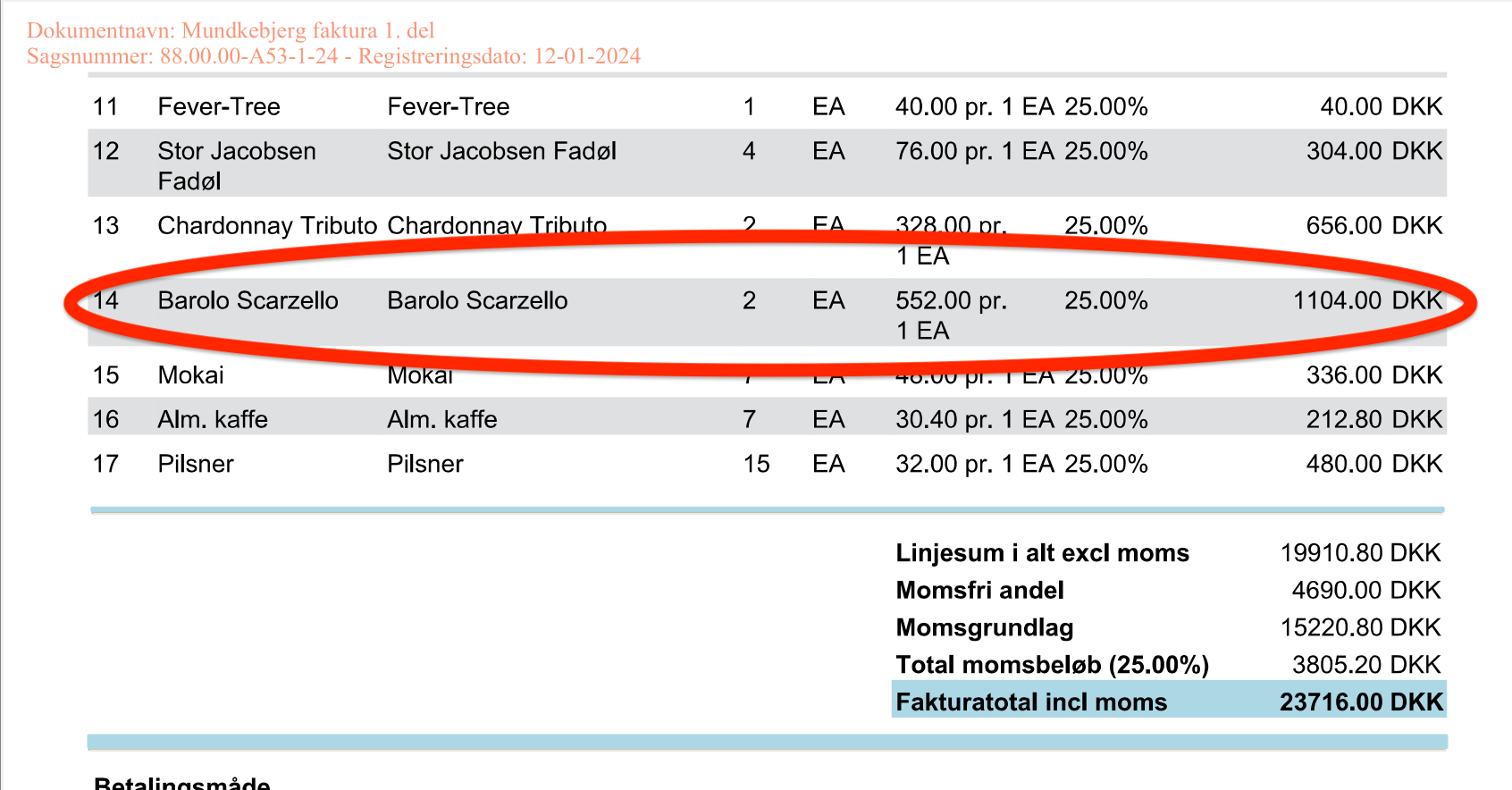 Her blev det blandt andet til to flasker af den prestigefyldte vin Barolo til 690,- flasken. Husets vin kostede til sammenligning 325,- flasken. Altså over dobbelt så dyr vin som husets vin.