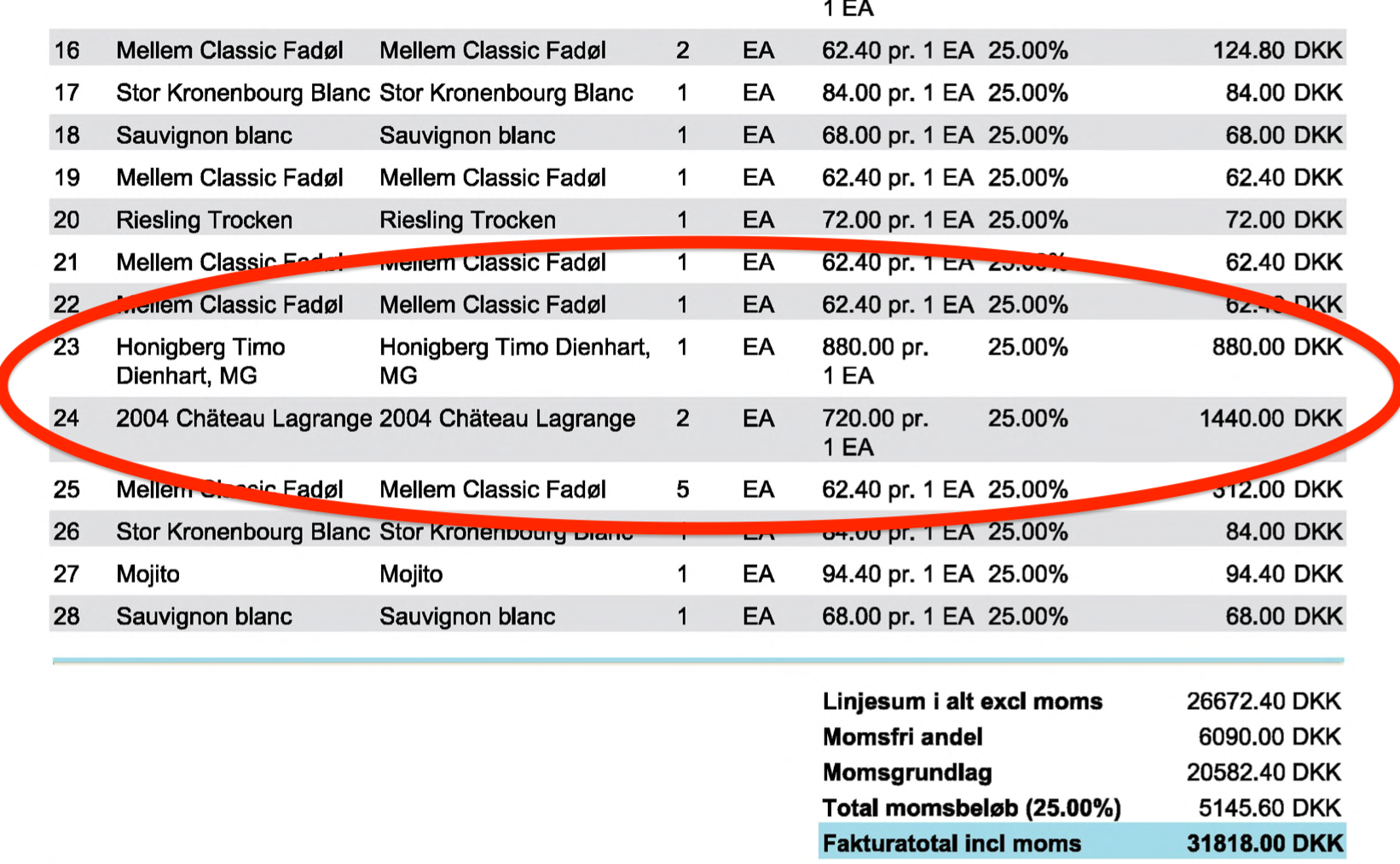 Her fik ledergruppen følgende udover ti fadøl, en Mojito og et par glas hvidvin også serveret to flasker Chåteau Lagrange 2004, som er en 3. cru Bordeaux til 900,- flasken, eller knap tre gange så meget som husets vin. De delte også en magnumflaske tysk Riesling vin til 1.100,-.
