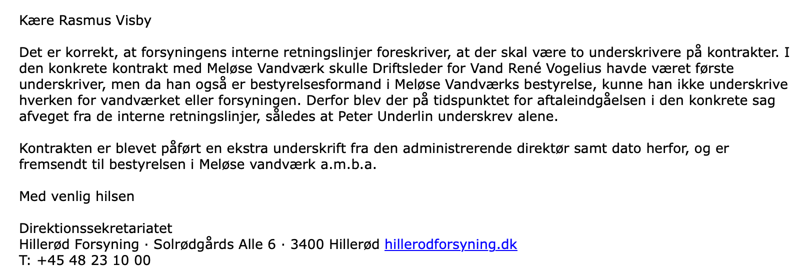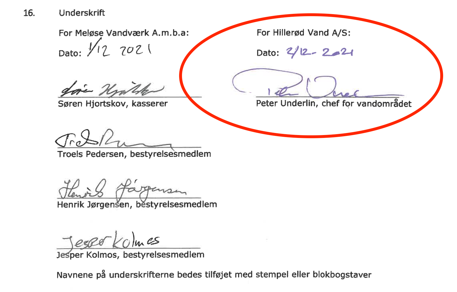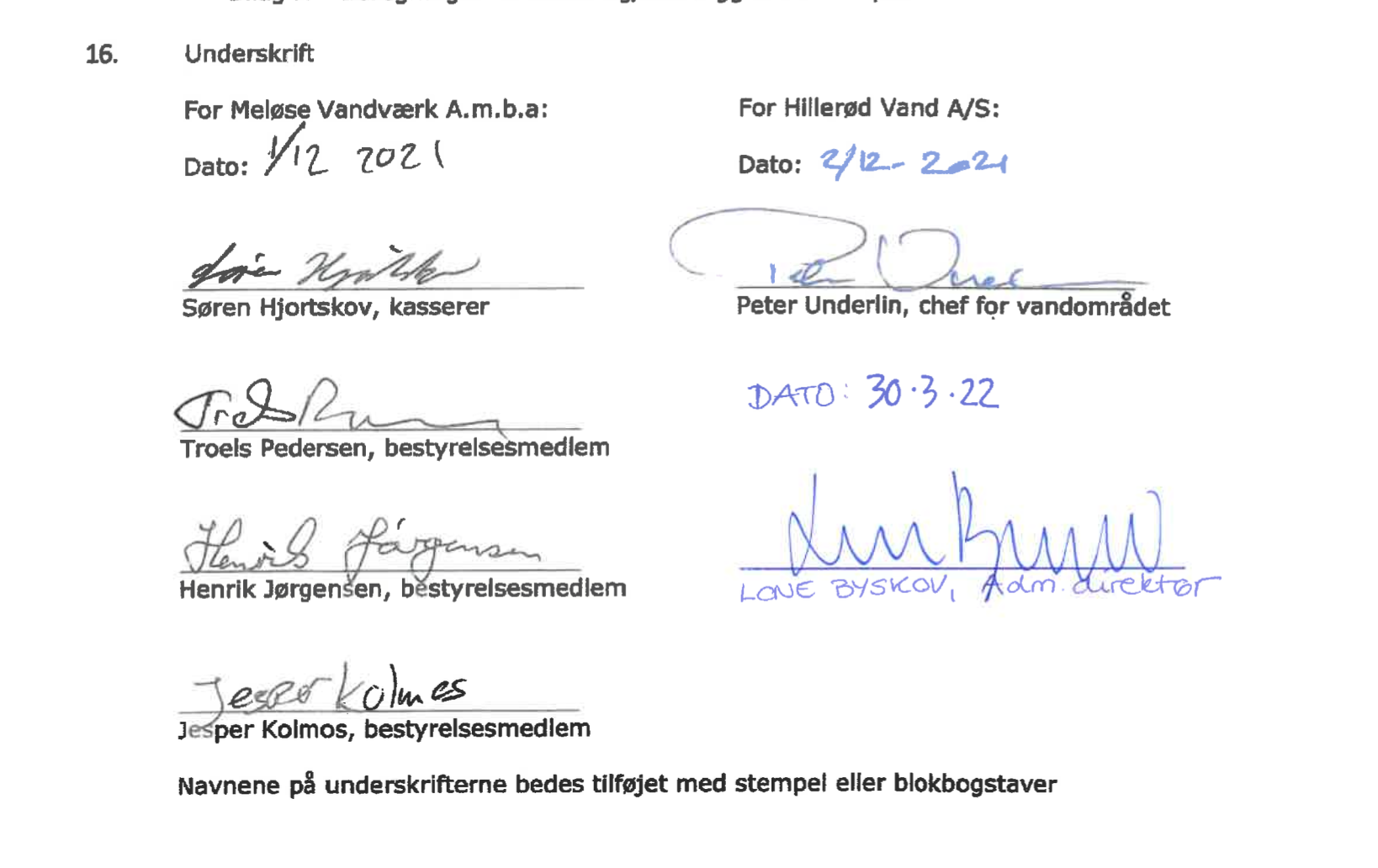 Kontrakten er blevet påført en ekstra underskrift fra den administrerende direktør samt dato herfor, og er fremsendt til bestyrelsen i Meløse vandværk a.m.b.a.