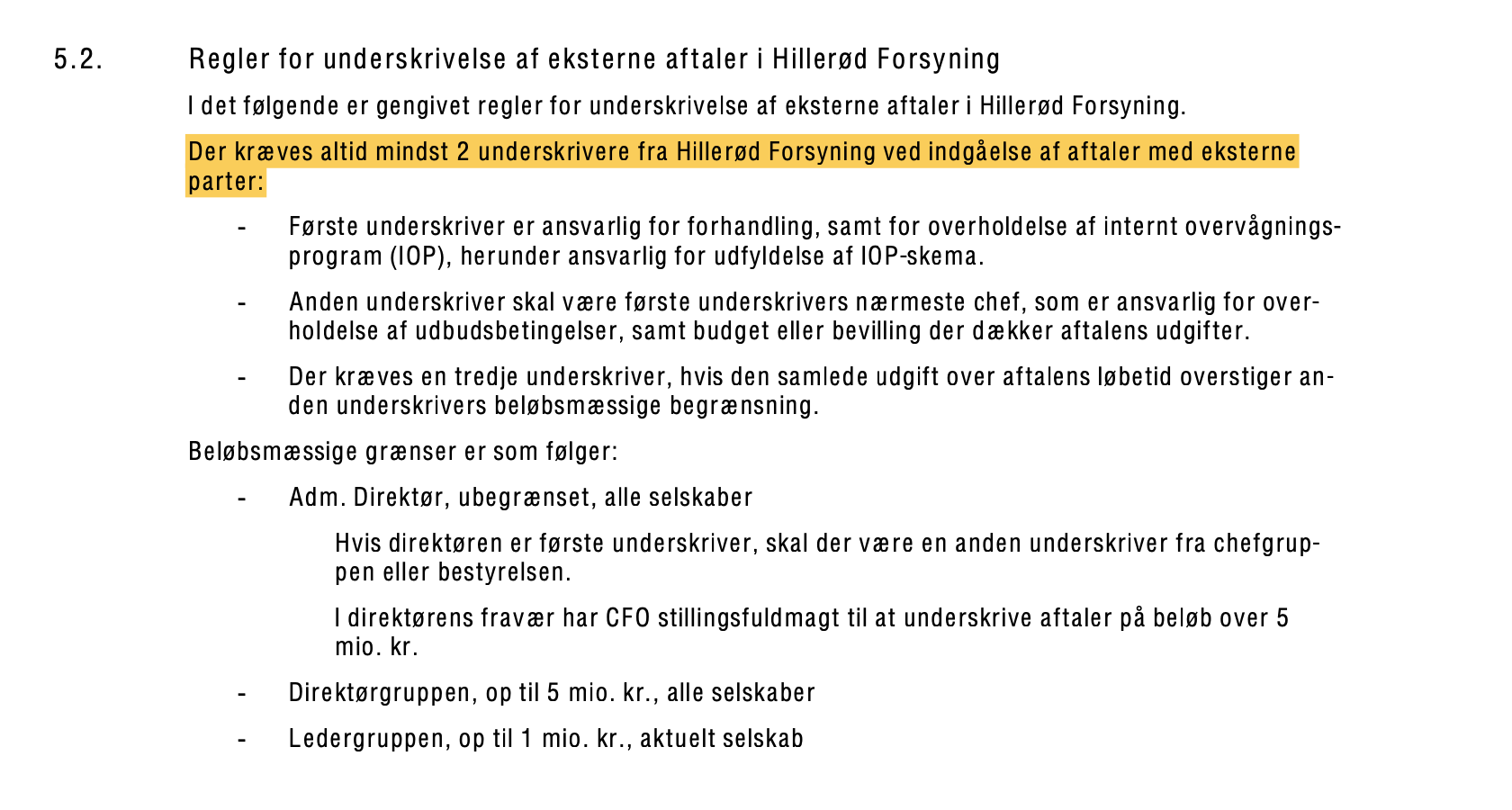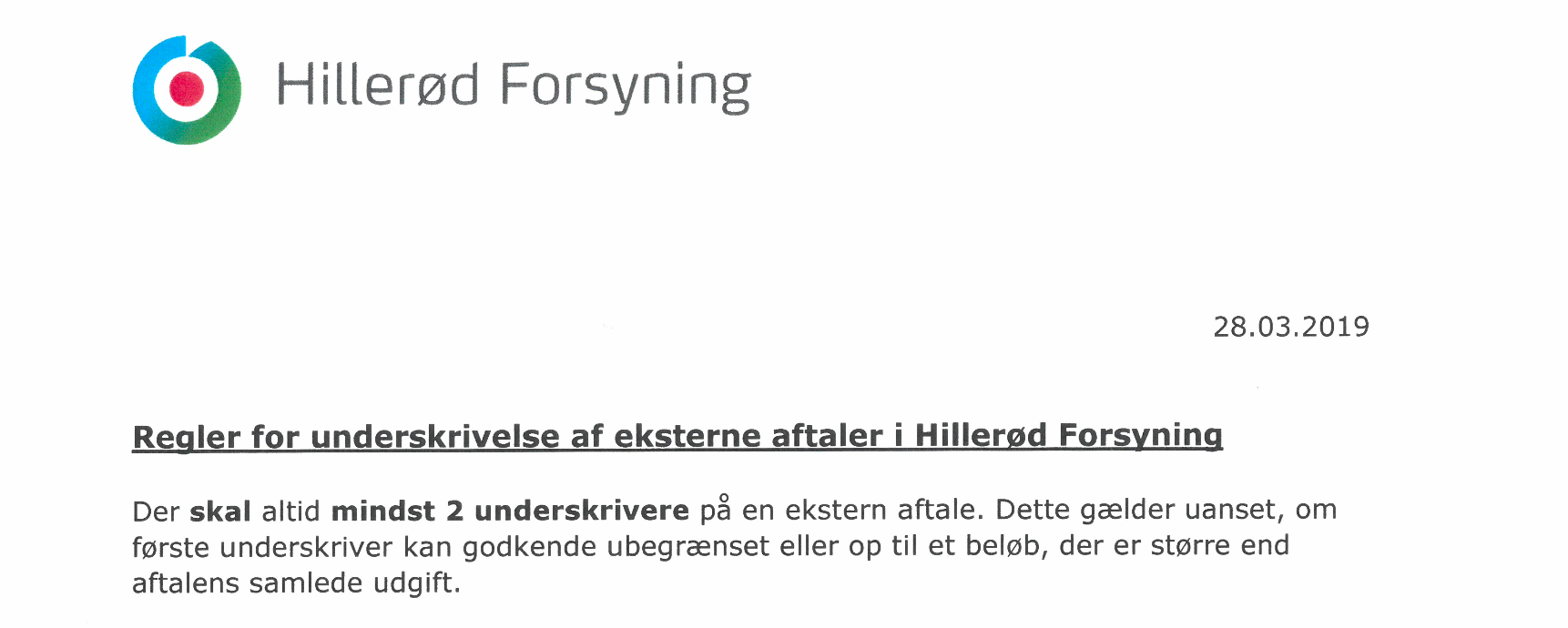 Trods reglerne, som fremhæves i revisorundersøgelsen, burde ledelsen have været bekendt med dem, da daværende adm. dir. Søren Støvring allerede i 2019 godkendte reglerne for underskrivelse af eksterne aftaler i Hillerød Forsyning.