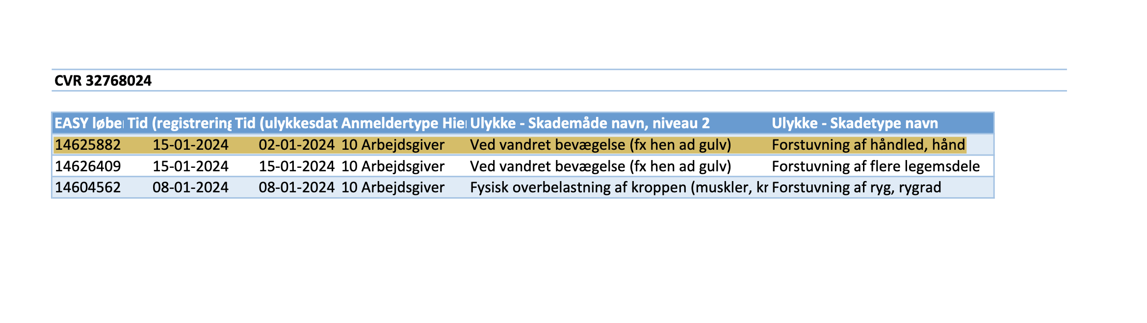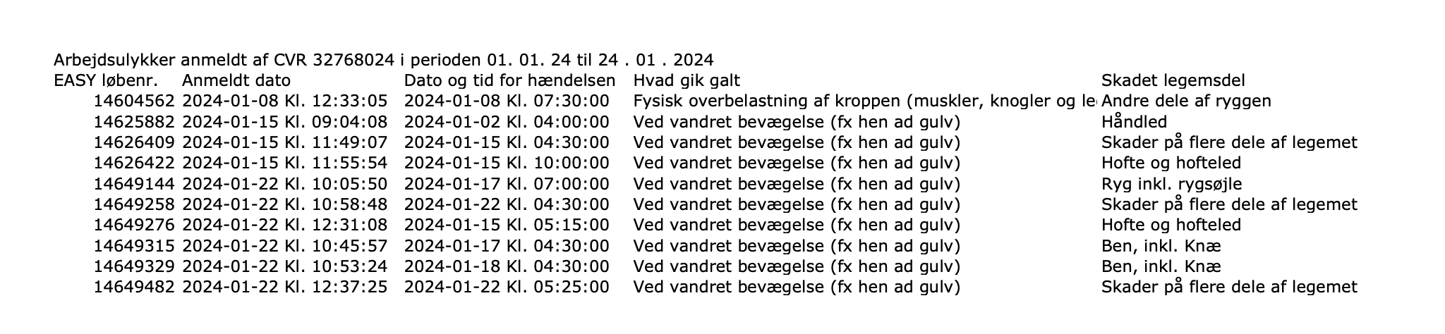 Hillerød Forsyning oplyser til Magtindsigt at der indtil videre i januar har været anmeldt ti arbejdsskader til Arbejdstilsynet. Dog er otte af de tilfælde hændt efter 12. januar hvor artiklen blev bragt i Frederiksborg Amts Avis og på SN.dk. En enkelt faldulykke skete 8. januar, og tilbage er dermed en enkelt fra arbejdsulykke fra 2. januar som hører under "de fire første arbejdsdage i det nye år?"