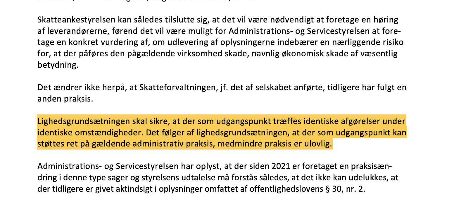Skatteankestyrelsen nåede frem til, at det ville være nødvendigt at høre leverandørerne, før de kunne vurdere, om udlevering af oplysningerne udgjorde en risiko for økonomisk skade. Men da Skatteforvaltningen tidligere havde udleveret data under lignende omstændigheder, tabte de sagen, og dataene blev udleveret. Dette sket med henvisning til Lighedsgrundsætningen som skal sikre, at der som udgangspunkt træffes identiske afgørelser under identiske omstændigheder. Det følger af lighedsgrundsætningen, at der som udgangspunkt kan støttes ret på gældende administrativ praksis, medmindre praksis er ulovlig.
