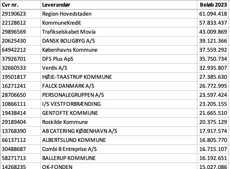 Der blev anmodet om en en samlet liste over alle kommunens leverandører og hvor meget de enkelte leverandører havde omsat for på et kalenderår. Se eksempel nedenfor fra Høje-Taastrup Kommune.