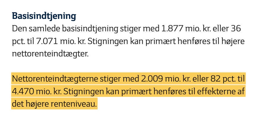 Nettorenteindtægterne i Danske Bank steg til 35 mia mod 25 mia i 2022. Stigningen skyldtes hovedsageligt højere indtægter fra indlån som følge af vores pristiltag og renteudviklingen samt udviklingen af nye produkter, skriver Danske Bank i uddrag fra årsrapporten 2023